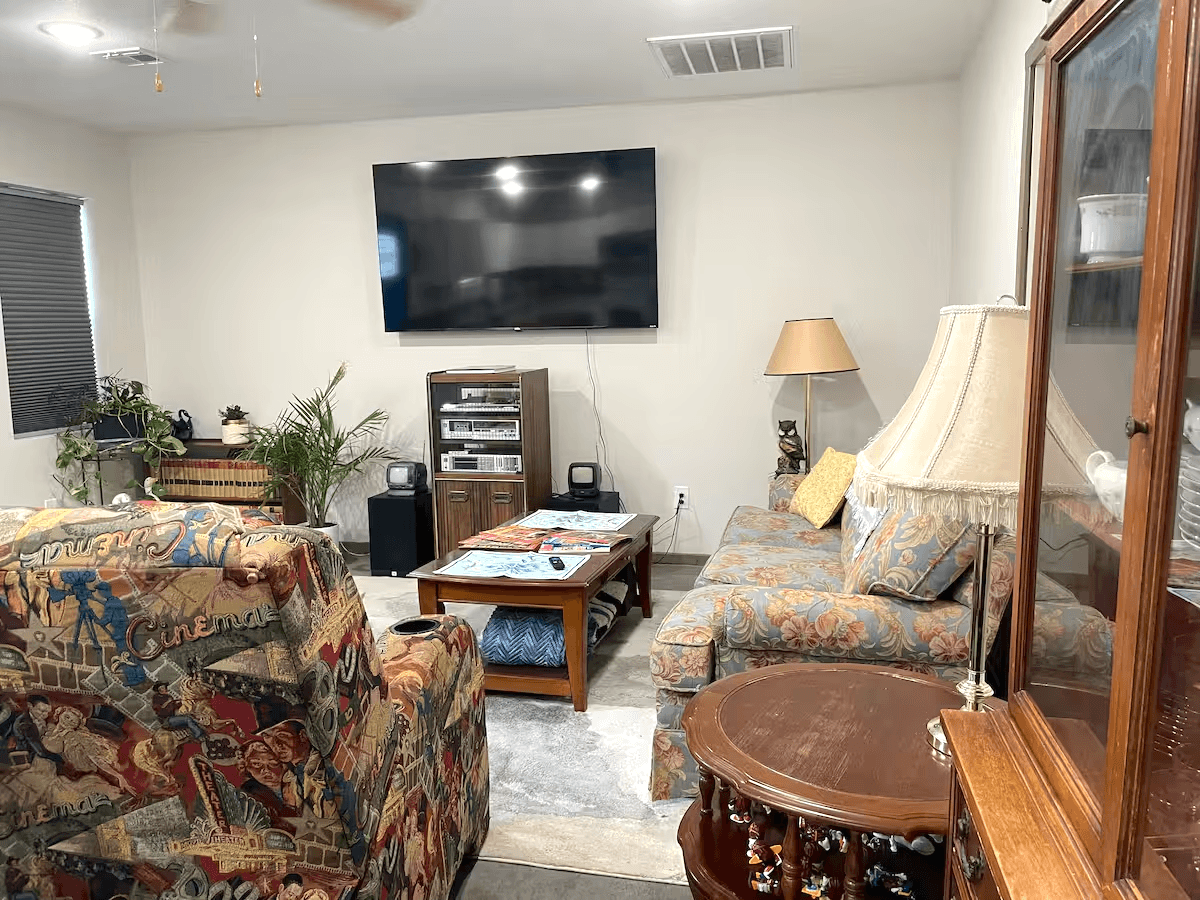 This is a 3 bedroom duplex. The smallest 3rd room is not for guest use. It is locked at all times. There is a small host supply closet that is locked. The Back to the Future house is part of a duplex fourplex unit. At times You can hear noise from the other unit. The two bedrooms for guest use are further away from the shared wall. The 3rd bedroom and the living room area share the wall with the other unit. The other unit does not have access to the third bedroom either. The house is part of a four plex. It has shared parking. However it provides a large space making drive through parking for a trailer or moving van convenient or one can park multiple vehicles during their stay.